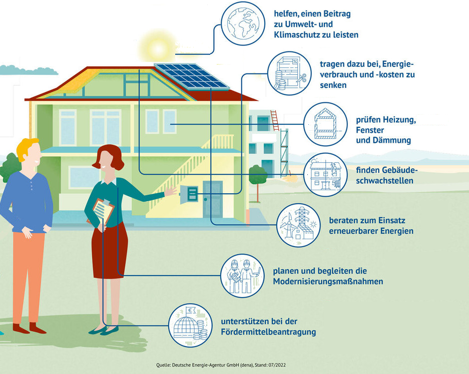 Die Beratung wird vom BAFA zertifizierten Energieeffizienz -Experten durchgeführt. Zur Leistung gehört ein Erstgespräch, gerne Vorort und mit kurzer Objektbegehung. Bei Beauftragung erfolgt eine Intensivbestandsaufnahme mit Berichterstellung und Vorschlägen zur energetischen Gebäudesanierung, je nach Auftragsumfang wird ein individueller Sanierungsfahrplan (iSFP) erstellt.